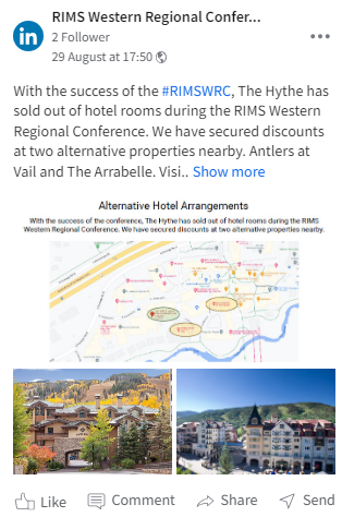 The Hythe has sold out of hotel rooms during the RIMS Western Regional Conference. We have secured discounts at two alternative properties nearby. Antlers at Vail and The Arrabelle. Visit Booking Link for additional options.