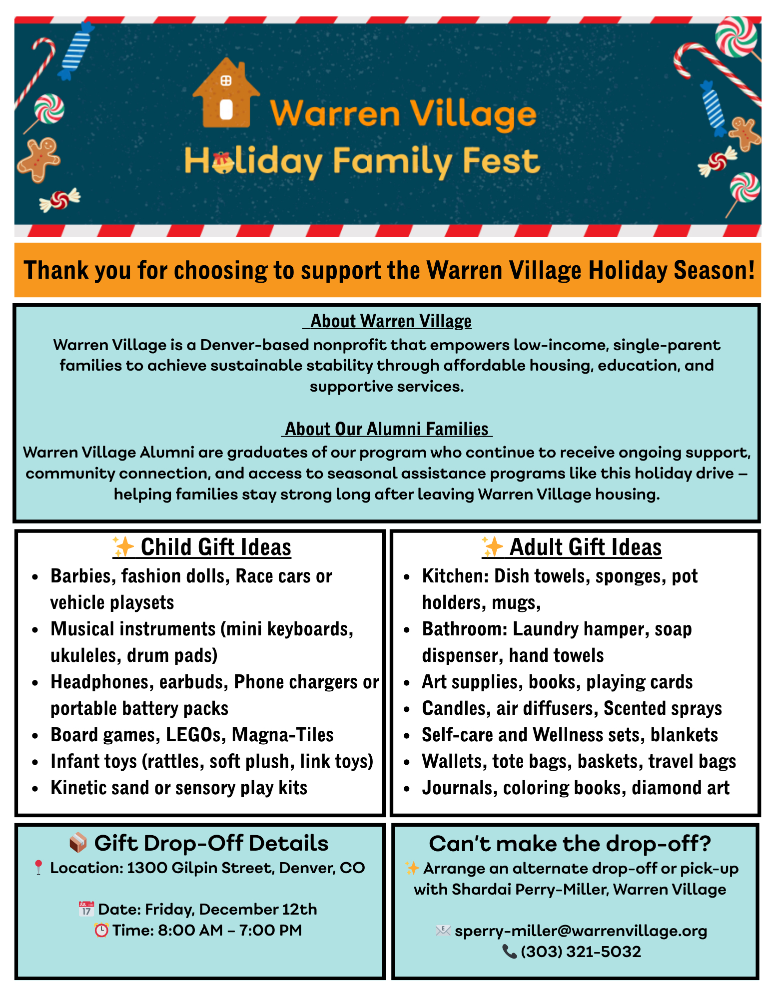 In the spirit of giving back, we encourage you to bring an unwrapped item from the this list for a donation to Warren Village. We will be collecting items at the event, and your contribution will help make a real impact on those in need.
